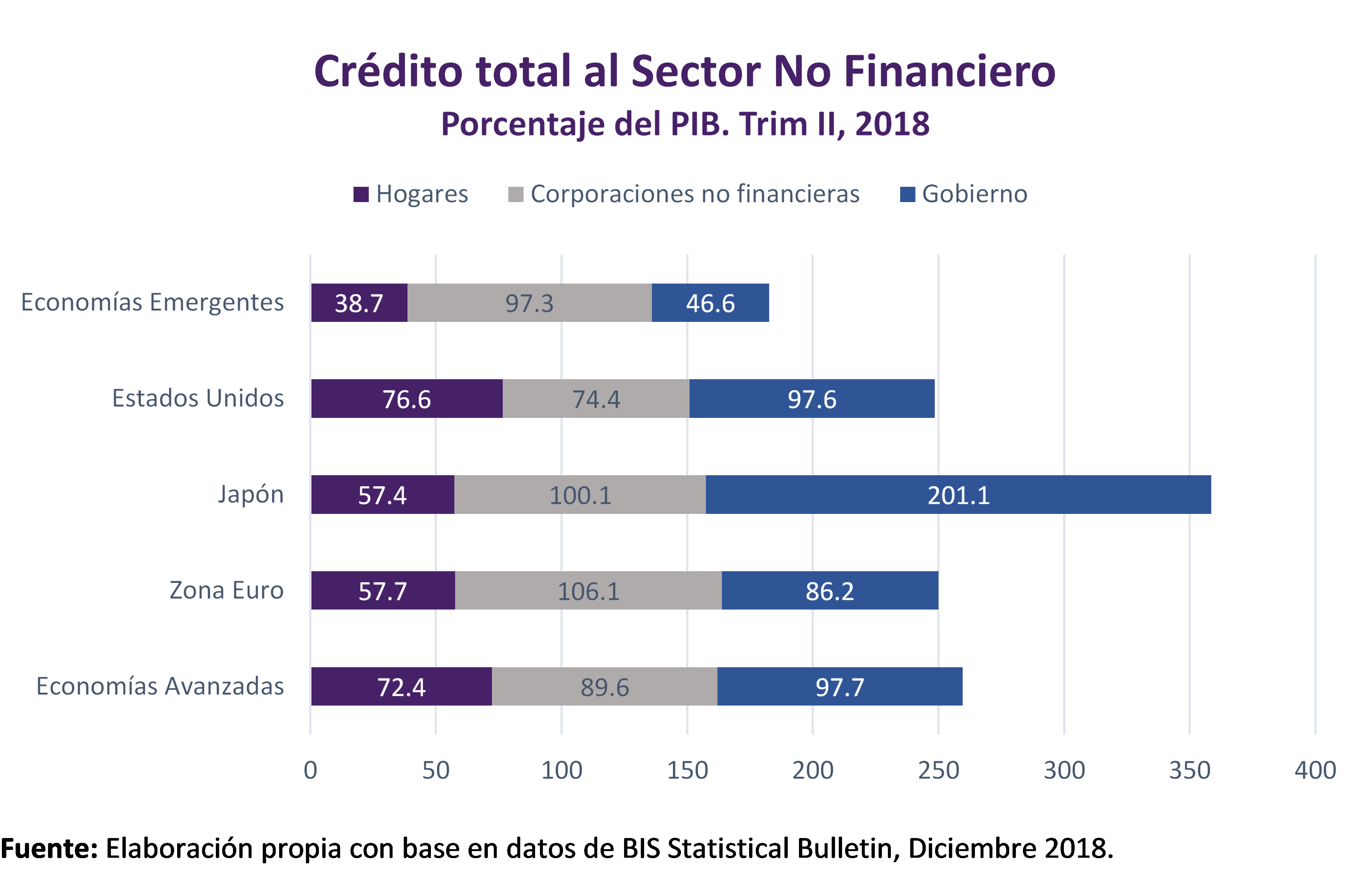 Es así que, a partir de la década de 1970, el mundo comienza una etapa de transnacionalización de sistemas productivos y financieros basados en la liberalización y desregulación, apalancados por estos instrumentos de deuda. Dichos mecanismos se siguieron expandiendo y han generado inestabilidad de la economía mundial, como lo muestran las recurrentes crisis financiaras (Magaña ét al, 2014). Para el segundo trimestre de 2018, la deuda ya supera en más del 250% el PIB de la mayoría de las economías avanzadas y el 180% de las economías emergentes.