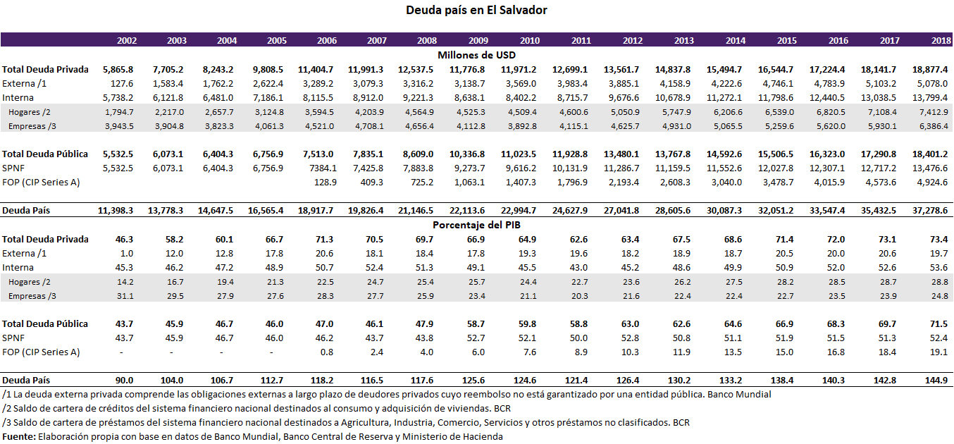 De modo que, tanto para el sector privado como el público, la deuda se ha convertido en el mecanismo para paliar los efectos de los problemas estructurales generados por el modelo socioeconómico posguerra. La deuda privada alcanza los $18,877.4 millones para 2018 (cifra preliminar), equivalente al 73.4% del PIB. Para los hogares, los $7,412.9 millones de deuda representan una forma en que, junto con el trabajo no remunerado y el flujo de remesas, se compensa el ingreso debido a los bajos salarios. La deuda de las empresas, que constituyen también los deudores de la deuda externa privada, totaliza $11,464.42 millones.