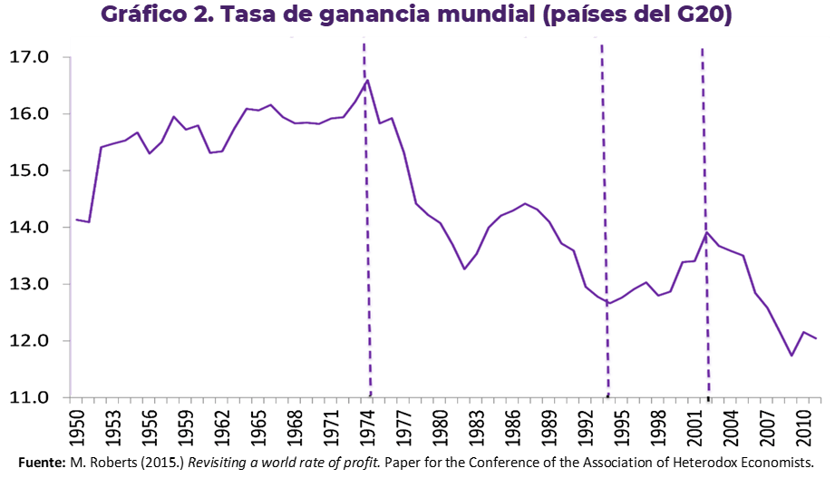 Roberts (2015) hace una estimación de la tasa de ganancia a lá Marx[1], para las economías del G20 desde 1950, usando datos de Penn World Tables. En la estimación de Roberts (2015) es claro el quiebre de la tasa de ganancia a partir de mediados de 1970, explicada por una crisis de sobreproducción, luego de la Etapa Dorada de postguerra. Esta estimación es coincidente con otras, realizadas por Duménil y Lévy (2011) o Kliman (2011).