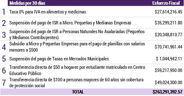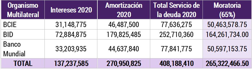 Para el financiamiento de estas medidas de emergencia será necesario un Acuerdo de Moratoria del 65% de las obligaciones de pago del servicio de la deuda para el ejercicio 2020 con el Banco Centroamericano de Integración Económica, el Banco Interamericano de Desarrollo y el Banco Mundial. Este año debemos pagar $408.2 millones en servicio de la deuda a estas instituciones financieras y un acuerdo de este tipo permitiría liberar del Presupuesto General del Estado $265.3 millones para estas medidas de emergencia.