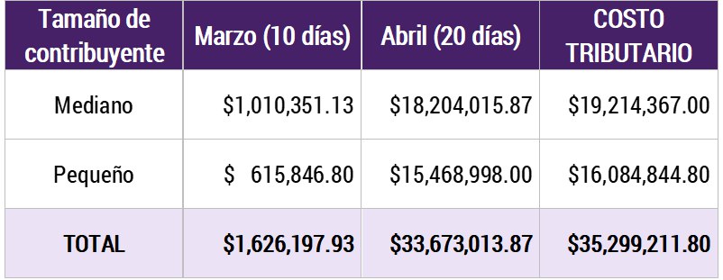 Las medidas de aislamiento social, restricciones a la circulación y cierre de locales generará dificultades para la sostenibilidad financiera de las Micro, Pequeñas y Medianas Empresas. Una medida para aliviar el estrés financiero es la exención durante 30 días del pago del Impuesto Sobre la Renta (ISR) a personas jurídicas identificadas por el Ministerio de Hacienda como Medianos y Pequeños Contribuyentes, siempre que demuestren haber cumplido con el pago de planilla. Esta medida implicaría un sacrificio de ingresos de $35.3 millones para el Estado.